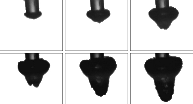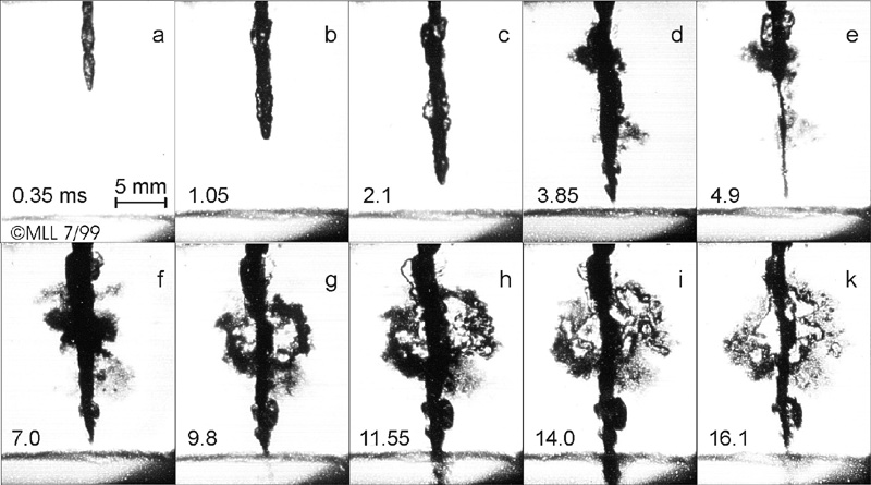 Es wurde die STROBODRUM Trommelkamera und die NANOLITE KL-L am MINISTROBOKIN Steuergerät verwendet. Die Zeitpunkte der Aufnahmen in bezug auf den Beginn des Laserpulses sind in den Bildern angegeben (+/-20µs).