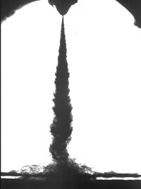 Düsennahbereich eines Common-Rail Systems bei Umgebungsbedingungen und 800 bar Einspritzdruck wenige µs nach Einspritzbeginn (Ausschnitt ca. 1x1.4 mm^2)