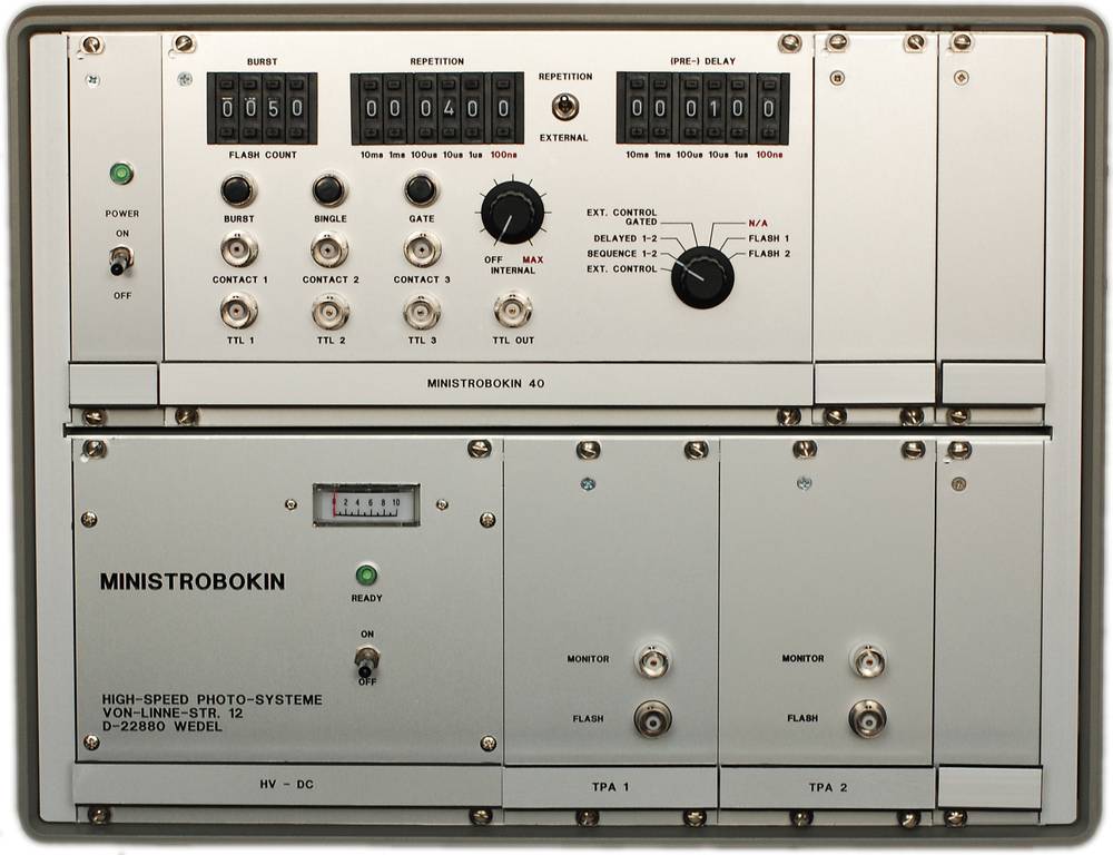 Das Ministrobokin 40 kann zwei Nanolite Lampen mit einer Frequenz von jeweils bis zu 20 kHz ansteuern. Im Sequenz-Modus, es werden im Wechsel beide Lampen angesteuert, ergibt sich dadurch eine Blitzfrequenz von bis zu 40 kHz. Es sind standardmäßig Bildsequenzen mit bis zu 400 Aufnahmen möglich.