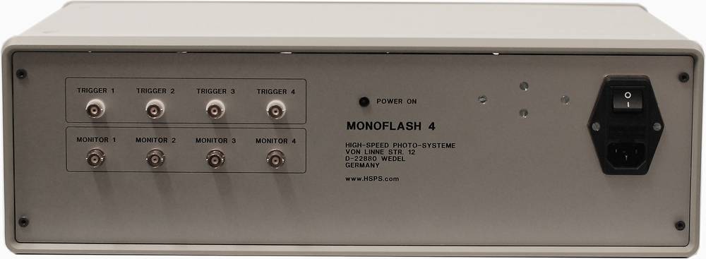 Der Monoflash4 dient als Hochenergie-Blitzlicht zur Erzeugung von vier einzeln getriggerten Blitze. Bei einer hohen Blitzenergie von jeweils bis zu 5 J beträgt die Halbwertszeit lediglich 500 ns.