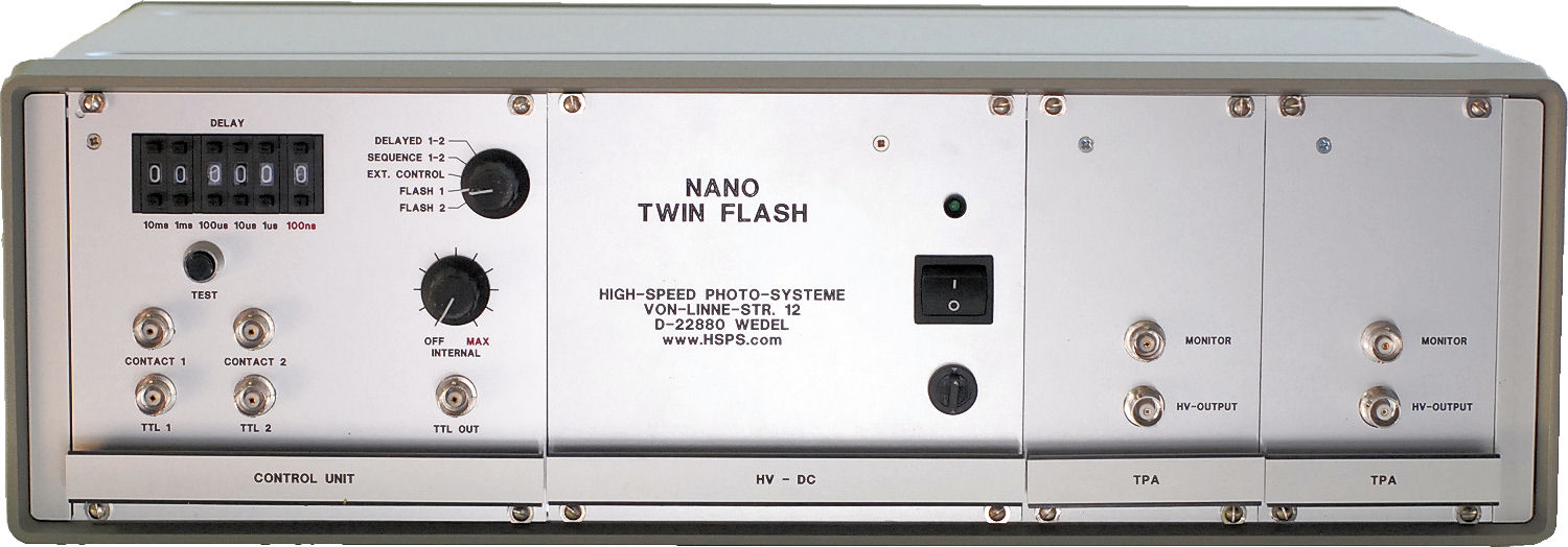 Mit dem NanoTwin lassen sich zwei Nanolite Lampen ansteuern. Typisches Einsatzgebiet ist die doppelt belichtete Aufnahme mit hochauflösenden Digitalkameras bei PIV und Bewegungsanalysen.